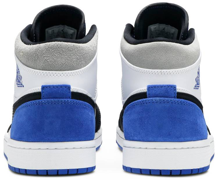 Suede sole The 1 Mid “Game Royal Black Toe combines two of the most recognizable colorways of Michael ’s first signature shoe in the popular mid-top silhouette. The “Bred Toe 1 . which was an original colorway of the shoe from 1985 . inspires the color block of the white perforated leather toe and black leather overlays on the forefoot. Branding appears in the form of a black leather Swoosh on the mid-panel and Game Royal “Wings detailing on the white leather collar. A black nylon tongue with blue “ branding on the black leather tongue tab completes the look of yet another stately 1 Mid. Release date: Summer 2020 The 1 Mid “Game Royal Black Toe combines two of the most recognizable colorways of Michael ’s first signature shoe in the popular mid-top silhouette. The “Bred Toe 1 . which was an original colorway of the shoe from 1985 . inspires the color block of the white perforated leather toe and black leather overlays on the forefoot. Branding appears in the form of a black leather Swoosh on the mid-panel and Game Royal “Wings detailing on the white leather collar. Grey suede is located on the collar and royal blue suede dots the heel. A black nylon tongue with blue branding on the black leather tongue tab completes the look of yet another stately 1 Mid. Release date: Summer 2020.